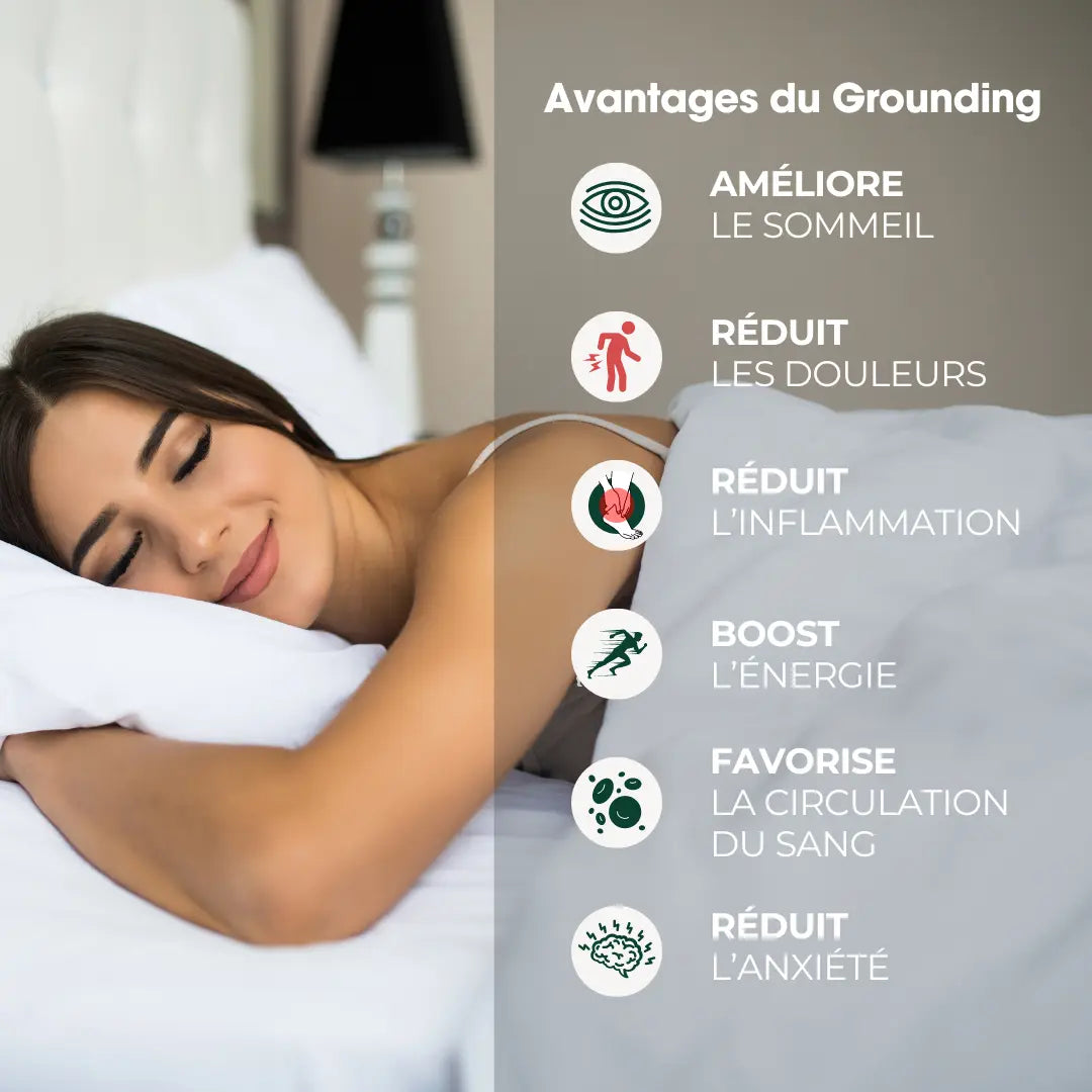 La mise à la terre reconnecte le corps aux électrons naturels de la Terre, rétablissant votre équilibre électrique naturel pour favoriser la relaxation, le confort et le bien-être nocturne.